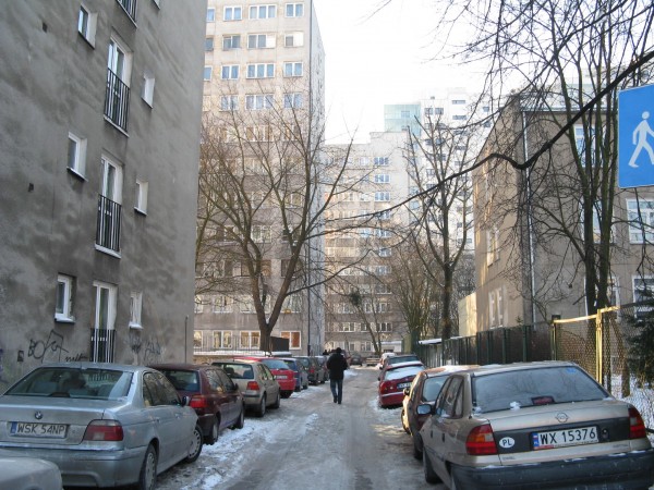 Uliczka wewnątrz osiedla, wjazd od ulicy Esperanto. Po prawej widoczny budynek szkoły nr. 222 im. Jana Brzechwy. W tle widać nowy apartamentowiec na przeciwko cmentarza żydowskiego. 23 stycznia 2010 roku.