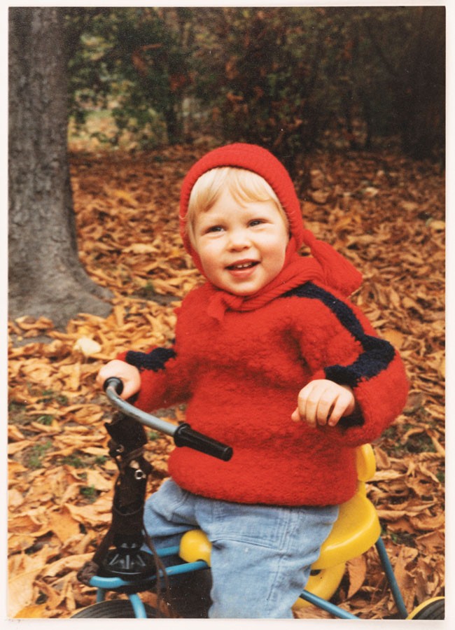 Chłopiec na rowerze wśród zabytkowych drzew jesiennego Ogrodu Krasińskich.