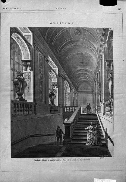 Schody główne Pałacu Krasińskich (Pałacu Senatu, Pałacu Rzeczypospolitej), na rycinie z „Kłosów” [Nr 572 T., XXII, s. 372] wg rys. L. Dymitrowicza, zdjęcie pochodzi sprzed 1915 roku.\n