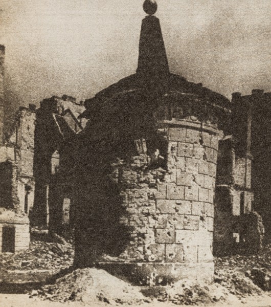 Ostrzelana podczas walk studnia Gruba Kaśka na tle ruin placu Tłomackiego, 1945 r.